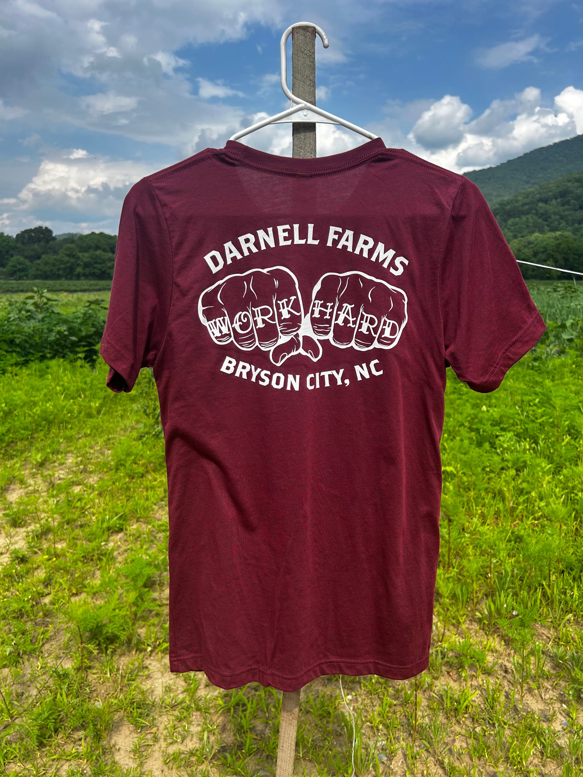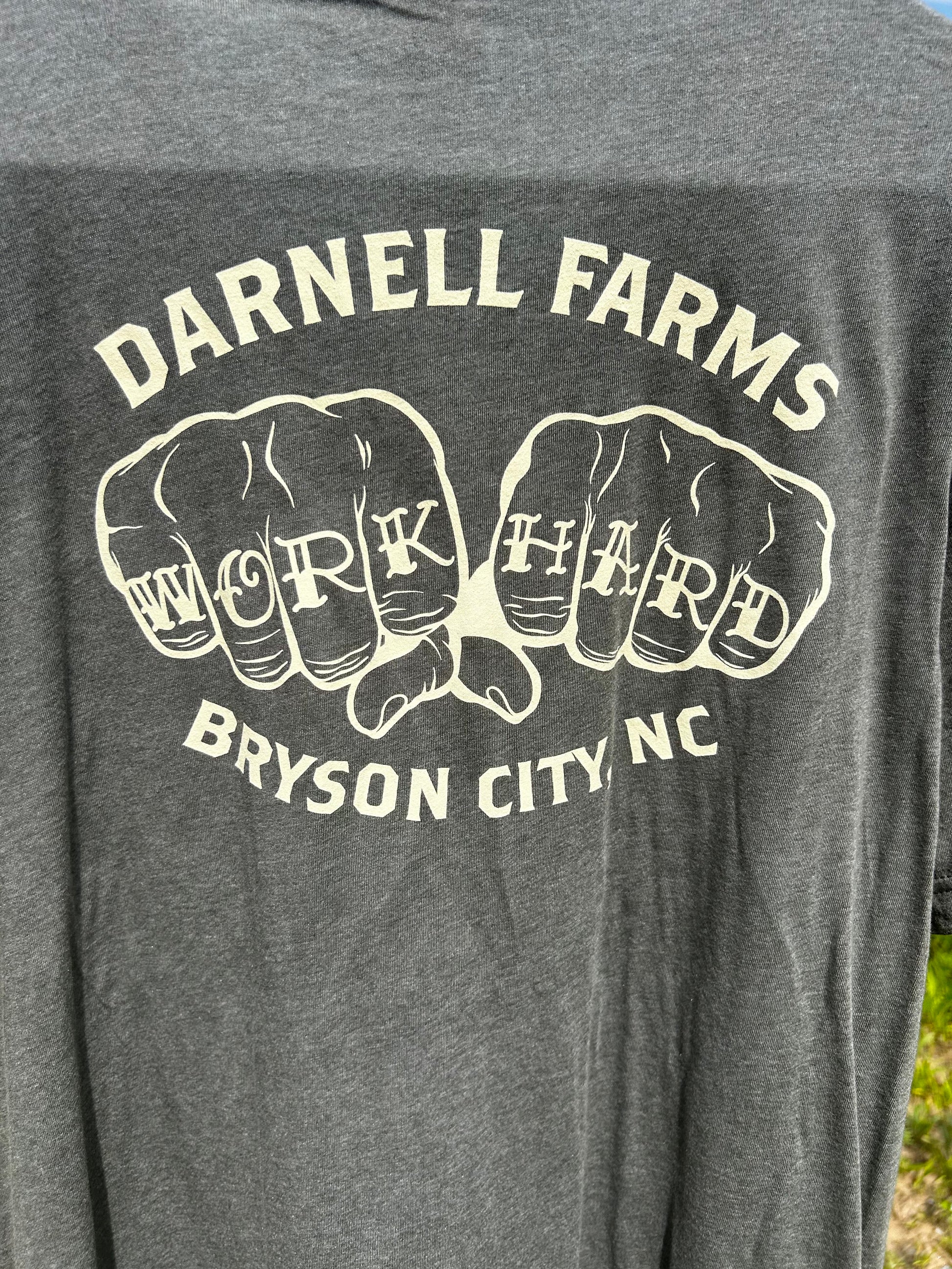 Features our "Work Hard" Knuckle Tattoo on the back of the shirt. Small Darnell Farms logo design on the front of shirt.